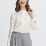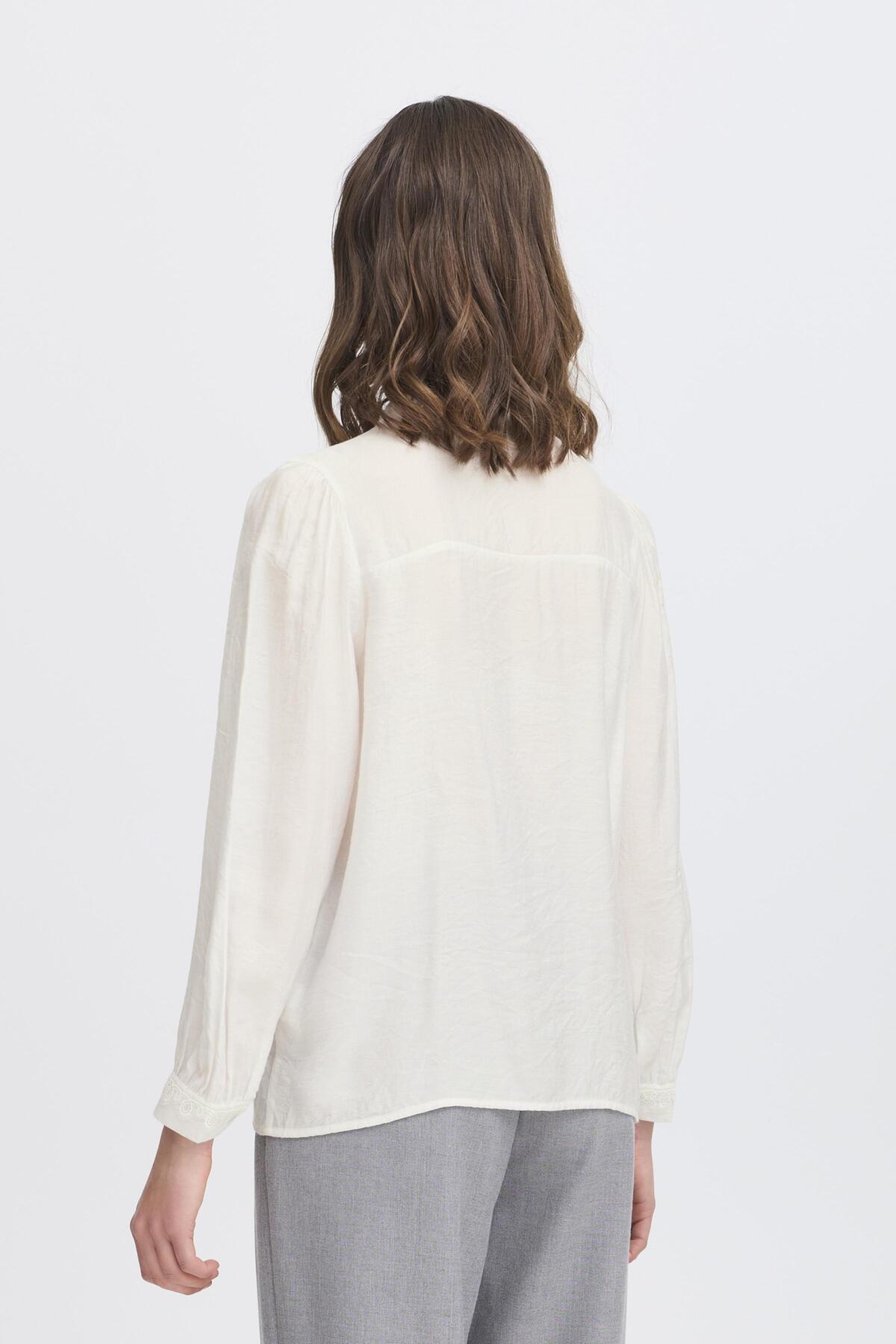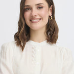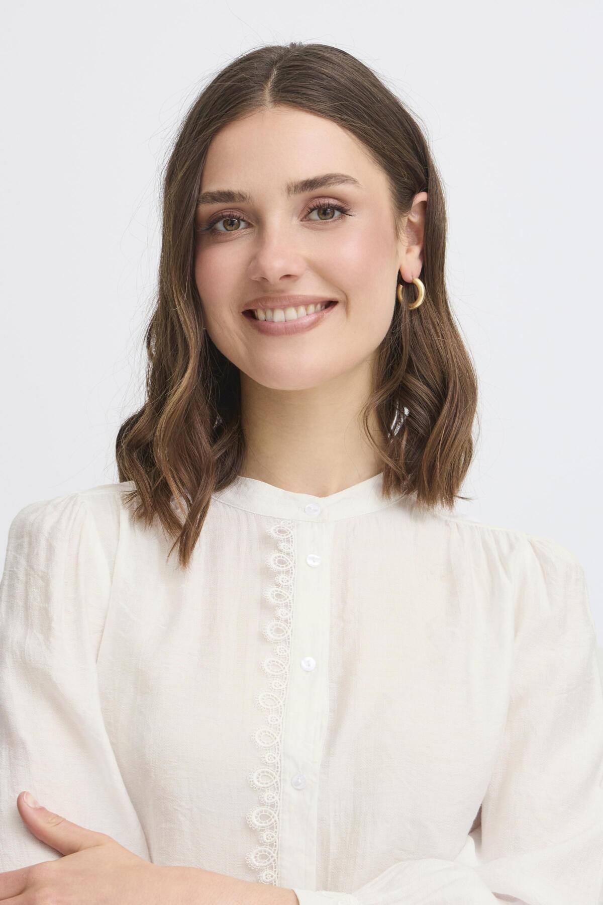 Elevate your wardrobe with the BLONDIE Shirt 3 in crisp white. This versatile Fransa piece features exquisite crochet lace detailing along the front opening and neckline, paired with a flattering regular fit that works beautifully from office to evening. The delicate  neckline and full-button front create an effortlessly feminine silhouette that transitions seamlessly through your day, making it an essential addition to any modern woman's closet.