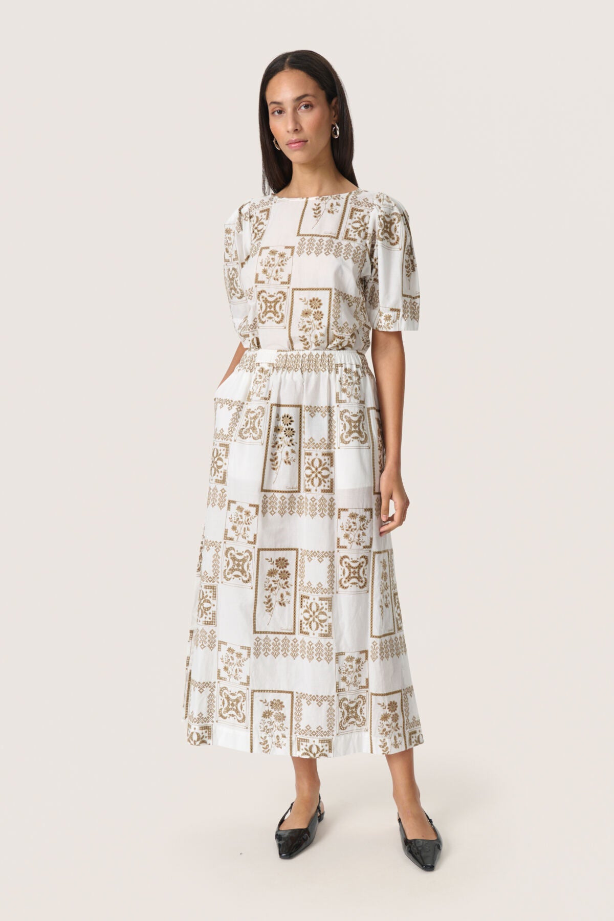 Elevate your wardrobe with this versatile cotton skirt, featuring an eye-catching print that transitions seamlessly from casual days to special moments. The comfortable elastic waistband ensures a flattering fit all day long, while the generous 96cm length offers elegant coverage. Crafted from pure 100% cotton, this piece delivers softness and breathability you'll love wearing again and again.